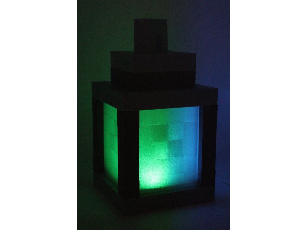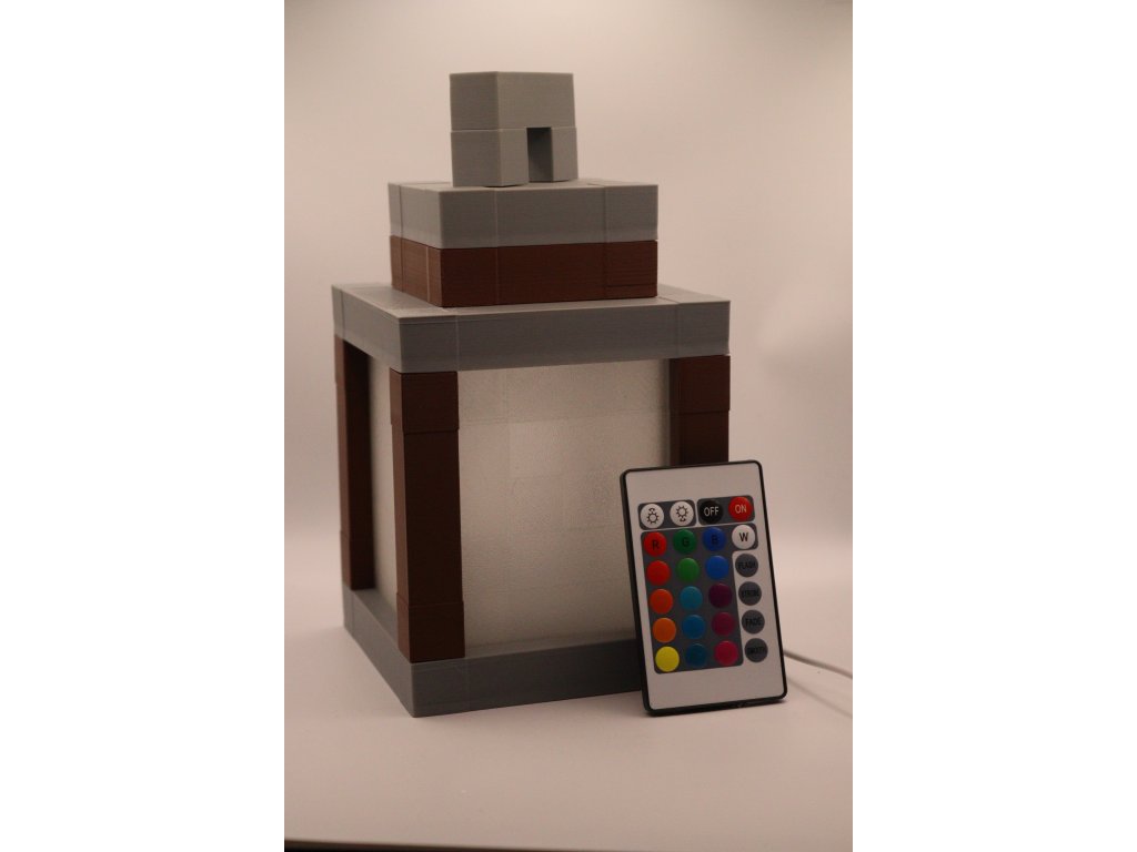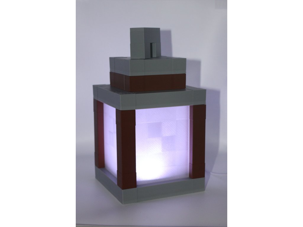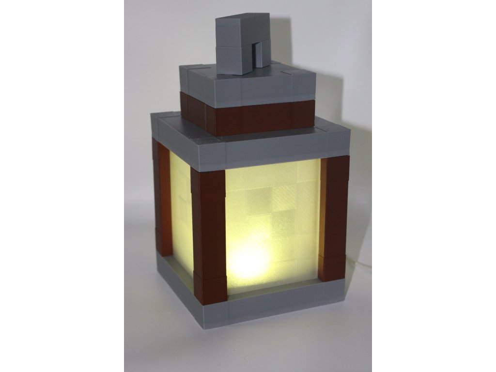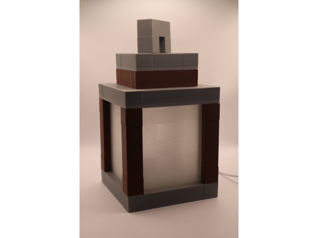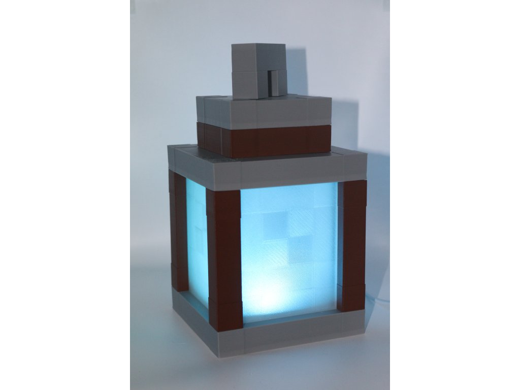 Stylová lucerna inspirovaná světem Minecraftu s funkčním LED osvětlením – 3D tištěná, skvělá jako dekorace nebo noční světlo. Na výběr ze dvou variant podle způsobu ovládání: